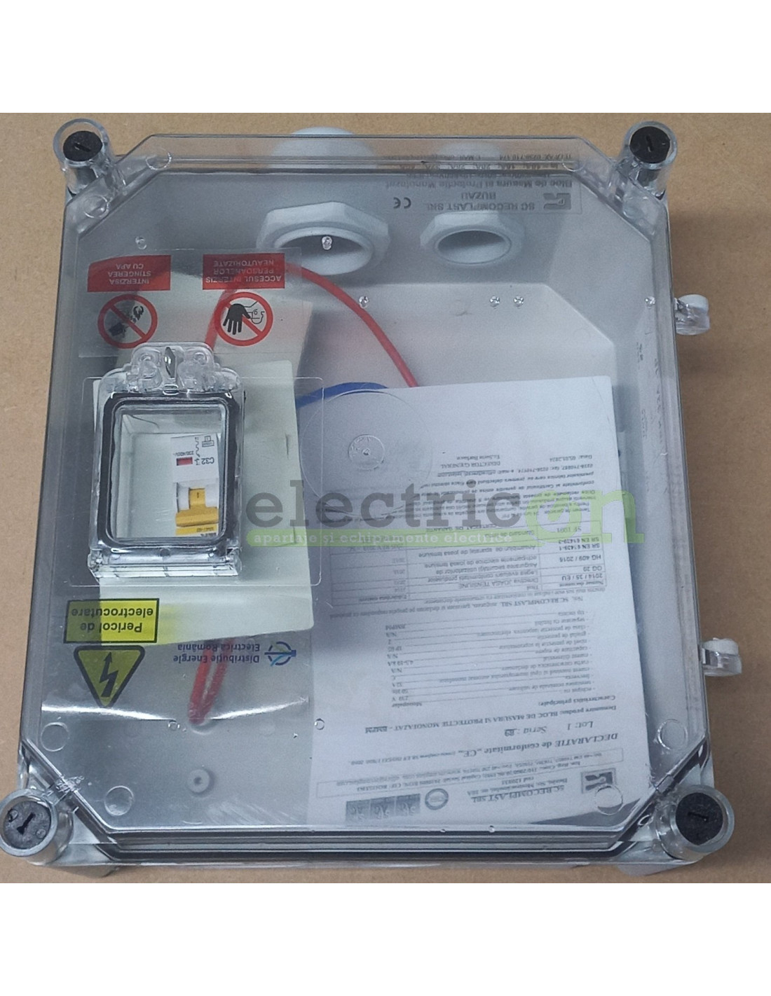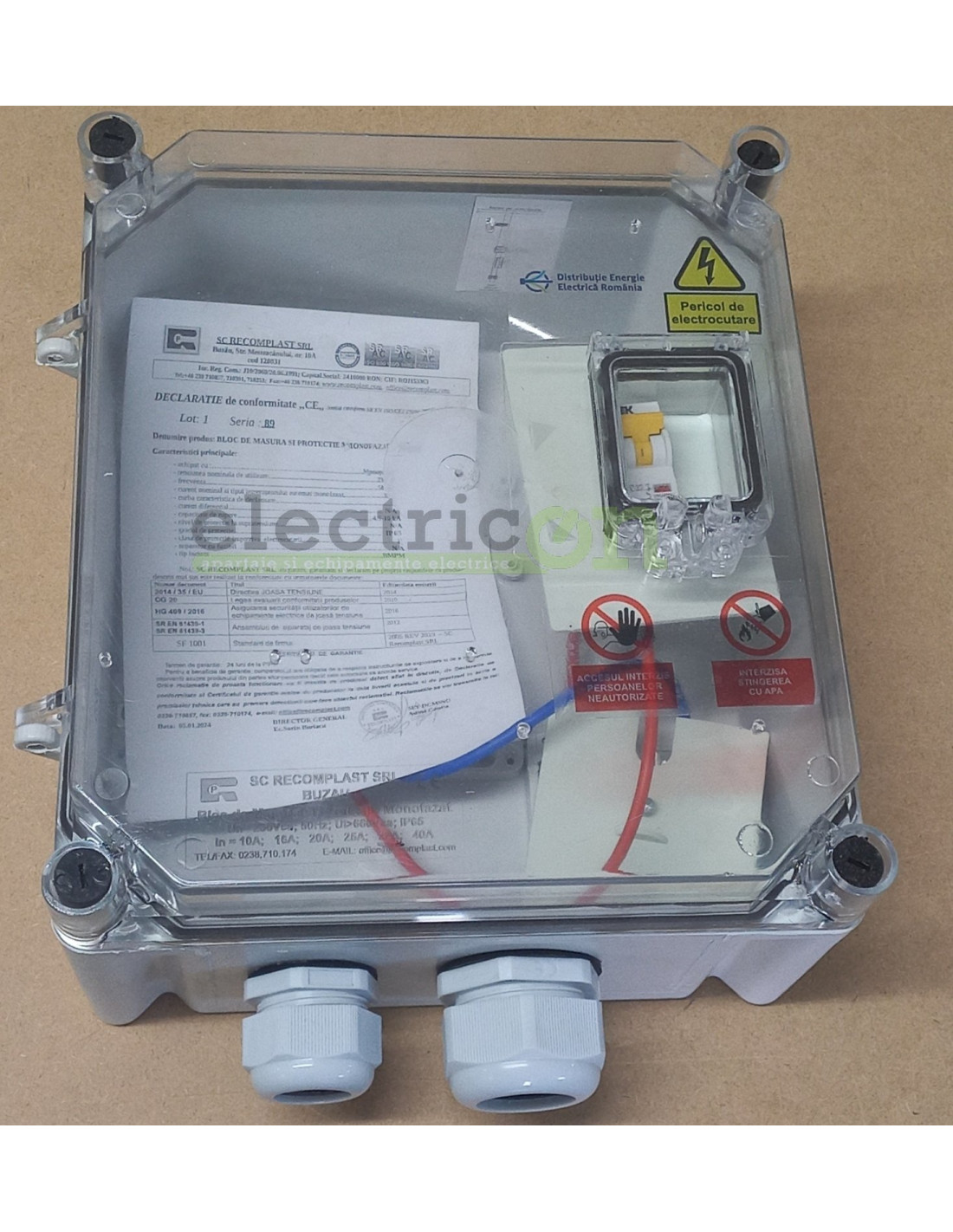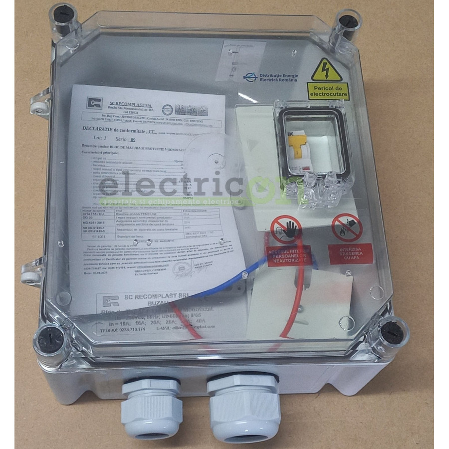 Bloc de masura si protectie monofazat (BMPM). Componente: spatiu pentru contor monofazat(nu este inclus), presetupe, cutie din policarbonat cu capac fumuriu transparent, fereastra de vizitare, siguranta.